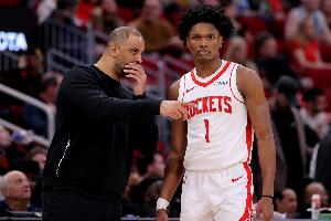 乌度卡:“是的,他几乎在随心所欲地攻击篮筐。他做了对方大概五个人都在做的事,不断地杀向篮下,给篮筐施加压力。然后就像我说的那样,当他到了那个位置时,开始做出正确的阅读并把球传出来。他今晚投篮感觉不是特别好,也没有投很多三分球,但在这方面他做好了自己的本职工作。只是作为一个团队,我们需要在一对一防守上做得更好。”